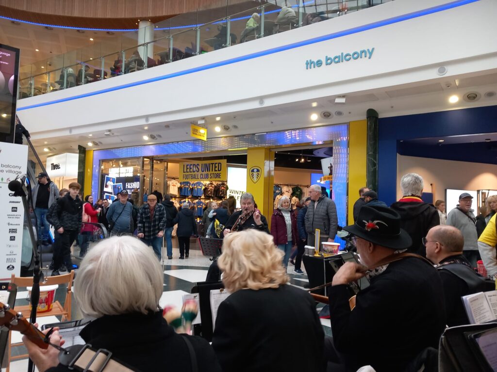 Yet another miserable February morning with unremitting rain and iron-grey skies as the band arrived at this bustling location, which is the polar opposite of the Ridings, there being plenty of big brands and expanding premises on show. Wakeylele, though, are always bright and breezy, whatever the weather, as Chris prepared his very smart looking troops for another ninety minutes of entertainment beneath the cavernous glass dome of this impressive shopping mall.