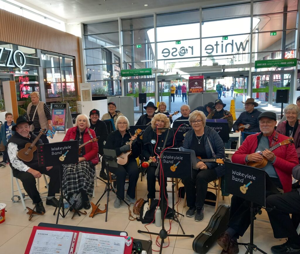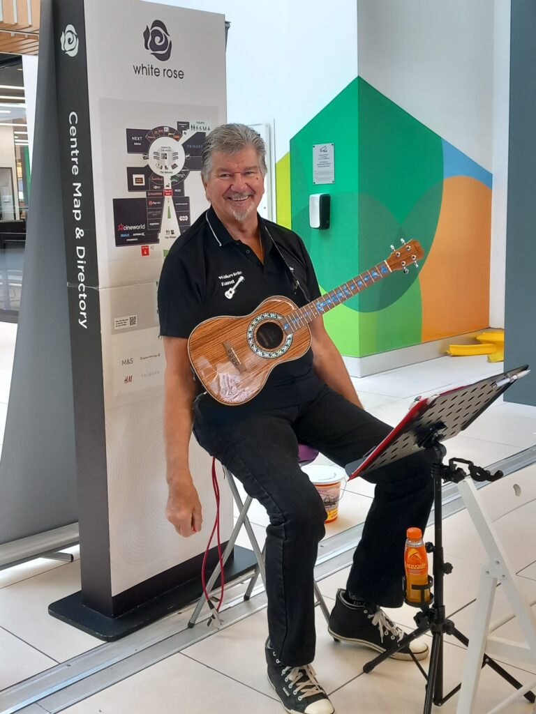 The first gig at this Leeds venue since the changing of the guard and a proper test of resilience it turned out to be too! As members of the band set off from their homes, Richard P sent out an emergency message of cancellation, but the majority of the group were en route by this time. On arrival, the reason for the cancellation notice became clear: our playing space next to the YAA stall was taken up by witches, giant pumpkins, and all things Halloween. However, Wakeylele is made of stern stuff, with an obstinate streak thrown in and so after a group huddle, Joe negotiated a deal with the management or/ and security people to play inside the top foyer. However, this wasn’t the end of our problems as the new location meant that there was a blast of Arctic air from the constant comings and goings of shoppers. Icicles were soon forming on the end of noses, and some fingers turned yellow, white, or purple. Those who arrived in top coats or fleeces were the lucky ones. Our leader, Chris, though, made light of the problem with adopted Yorkshire grit, proudly displaying his wakeylele t- shirt.